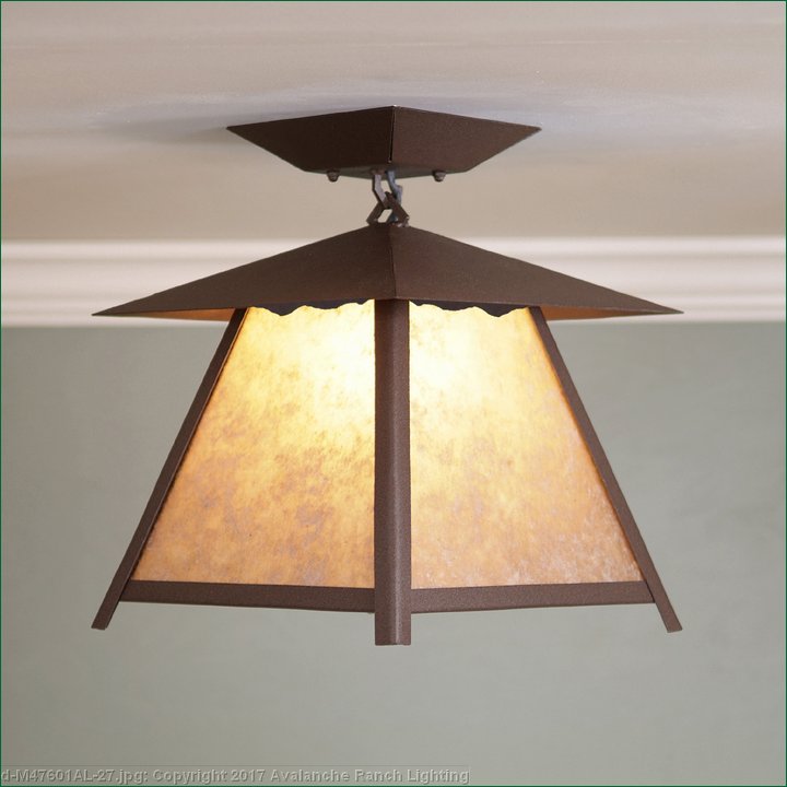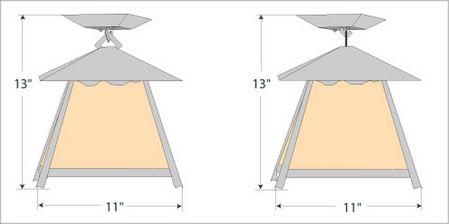 The Smoky Mtn Ceiling Light Large - Rustic Plain features our exclusive mountain artwork peeking out along the very top of each panel. The lantern also comes with a diffuser material choice between Almond or Amber mica. This fixture attaches to the ceiling with a square ceiling canopy, and is suitable for interior and damp locations only. This light will bring rustic lighting to any log home, cabin or northwood lodge-themed room.