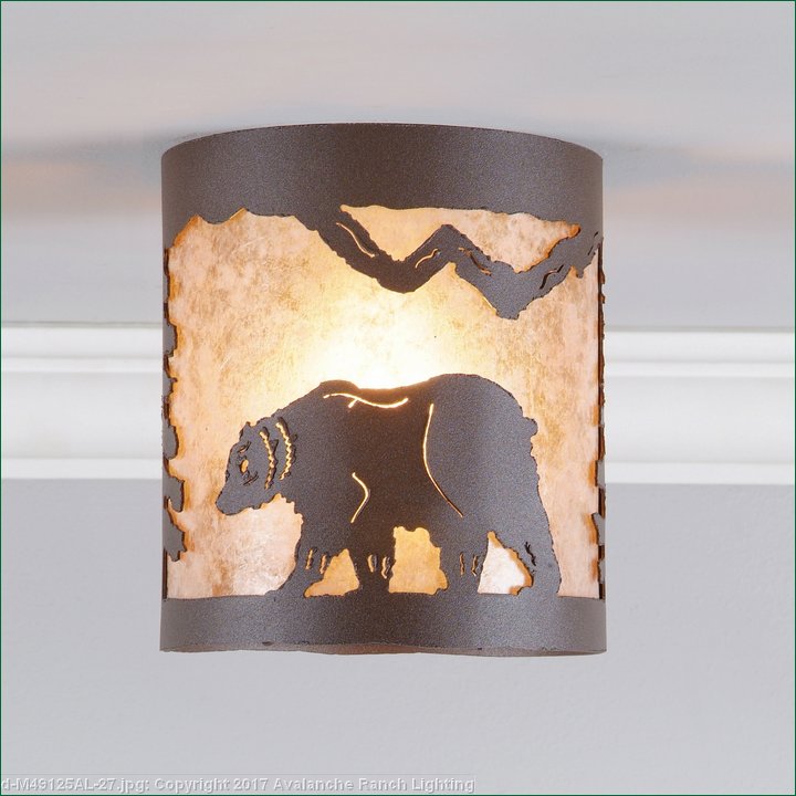 The Kincaid Drum Ceiling Light Small - Bear features a 7 inch round cylinder with a shade diffuser choice of color between Almond or Amber mica. It has a bear metal art image on the front and back and spruce trees on either side of the cylinder. Attaches to ceiling with a round ceiling canopy. Suitable for interior and damp locations only. This rustic ceiling light is ideal for bringing rustic lighting to any log home, cabin or northwood lodge-themed room.