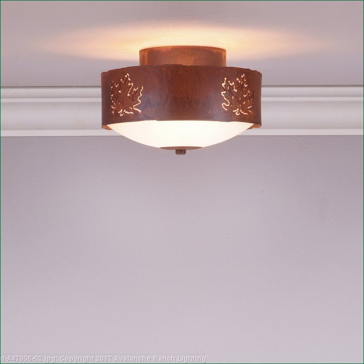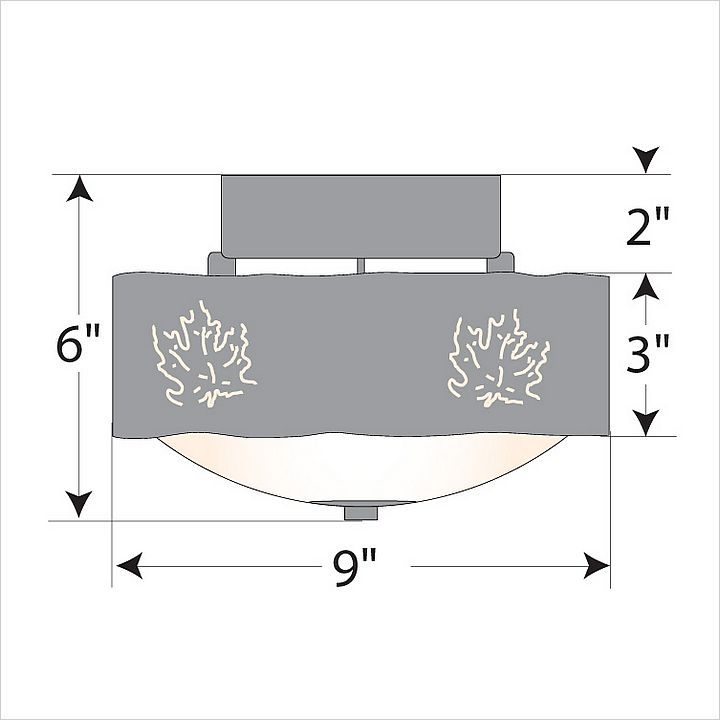 Ridgemont Close-to-Ceiling Small - Maple Cutout measures 9 inches in diameter and 6 inches high and features our exclusive maple art cutouts around the circumference of a steel band. Behind each cutout is a diffuser panel. The frosted glass bottom bowl detaches for bulb changing. For an unique addition to your rustic ceiling light, order one of the decorative Bottom Kits: a three-tree, 3D Spruce Cone or a 3D Pine Cone, any which can be ordered in the same or different color as the fixture. This item is ideal for anyone looking for a non-hanging light to add rustic, forest-inspired character to their log home, cabin or northwood lodge-themed room.