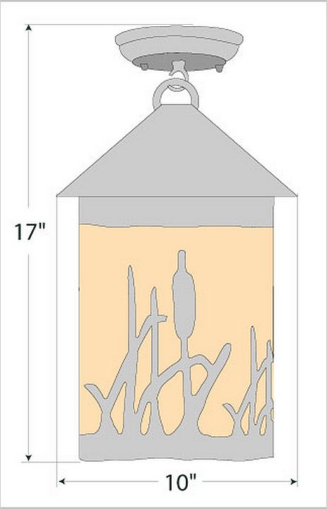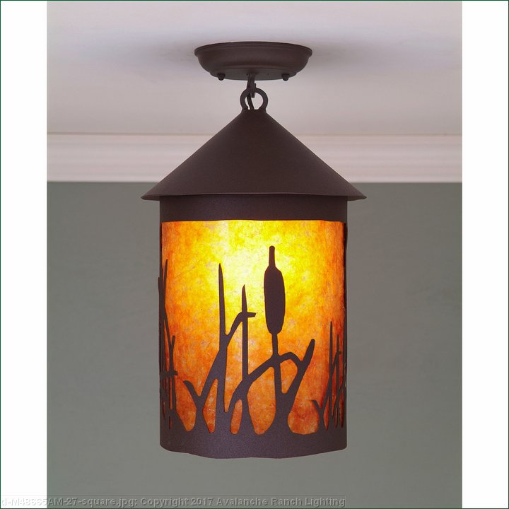 The Cascade Close-to-Ceiling Light Large - Cattails features a 8 inch round cylinder with a cone top and a shade diffuser choice of color between Almond or Amber mica. It has cattails metal art on the front and back and solid bands on either side of the cylinder. Attaches to ceiling with a round ceiling canopy. Suitable for interior and damp locations only. This rustic ceiling light is ideal for bringing rustic lighting to any log home, cabin or northwood lodge-themed room.