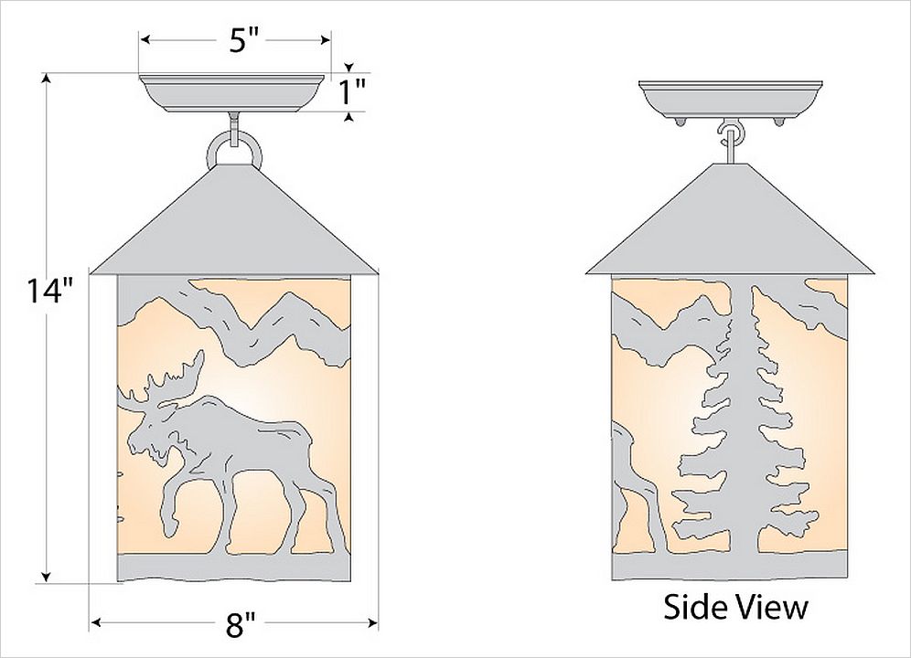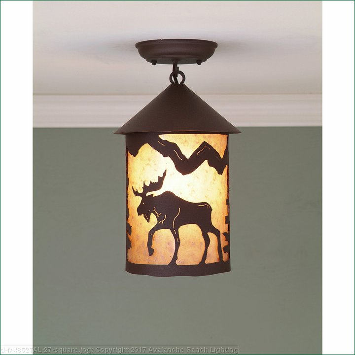 The Cascade Close-to-Ceiling Light Medium - Mtn Moose features a 6 inch round cylinder with a cone top and a shade diffuser choice of color between Almond or Amber mica. It has a moose metal art image on the front and back and spruce trees on either side of the cylinder. Attaches to ceiling with a round ceiling canopy. Suitable for interior and damp locations only. This rustic ceiling light is ideal for bringing rustic lighting to any log home, cabin or northwood lodge-themed room.