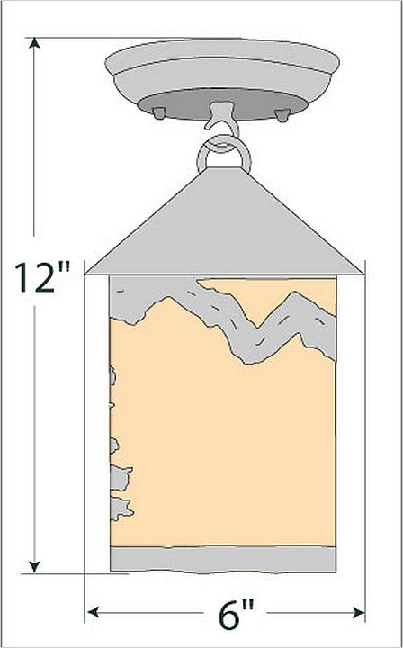 The Cascade Close-to-Ceiling Light Small - Rustic Plain features a 4 inch round cylinder with a cone top and shade diffuser choice of color between Almond or Amber mica. It has mountains on the front and back and spruce trees on either side of the cylinder. Attaches to ceiling with a round ceiling canopy. Suitable for interior and damp locations only. This light is ideal for bringing rustic lighting to any log home, cabin or northwood lodge-themed room.
