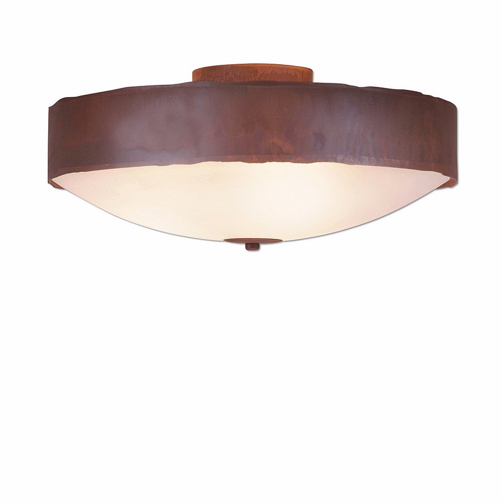Our Ridgemont Close-to-Ceiling Large - Rustic Plain measures 17 inches in diameter and 8 inches high and features a 2.75 inch steel band. The frosted glass bottom bowl detaches for bulb changing. This light is ideal for bringing rustic lighting to any log home, cabin or northwood lodge-themed room, hallway or kitchen.