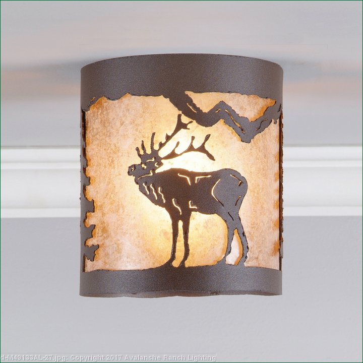 The Kincaid Drum Ceiling Light Small - Elk features a 7 inch round cylinder with a shade diffuser choice of color between Almond or Amber mica. It has a elk metal art image on the front and back and spruce trees on either side of the cylinder. Attaches to ceiling with a round ceiling canopy. Suitable for interior and damp locations only. This rustic ceiling light is ideal for bringing rustic lighting to any log home, cabin or northwood lodge-themed room.