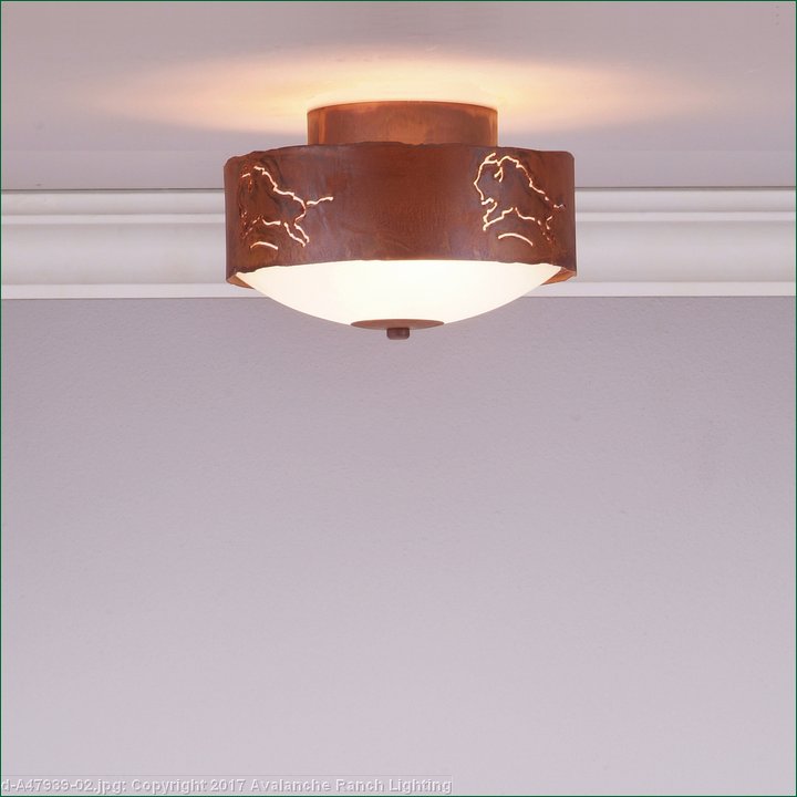 Our Ridgemont Close-to-Ceiling Small - Bison measures 9 inches in diameter and 6 inches high and features our exclusive southwest bison art cutouts around the circumference of a steel band. Behind each cutout is a diffuser panel. The frosted glass bottom bowl detaches for bulb changing. For an unique addition to your rustic ceiling light, order one of the decorative Bottom Kits: a three-tree, 3D Spruce Cone or a 3D Pine Cone, any which can be ordered in the same or different color as the fixture. This item is ideal for anyone looking for a non-hanging light to add rustic, Southwestern character to their log home, cabin or northwood lodge-themed room.