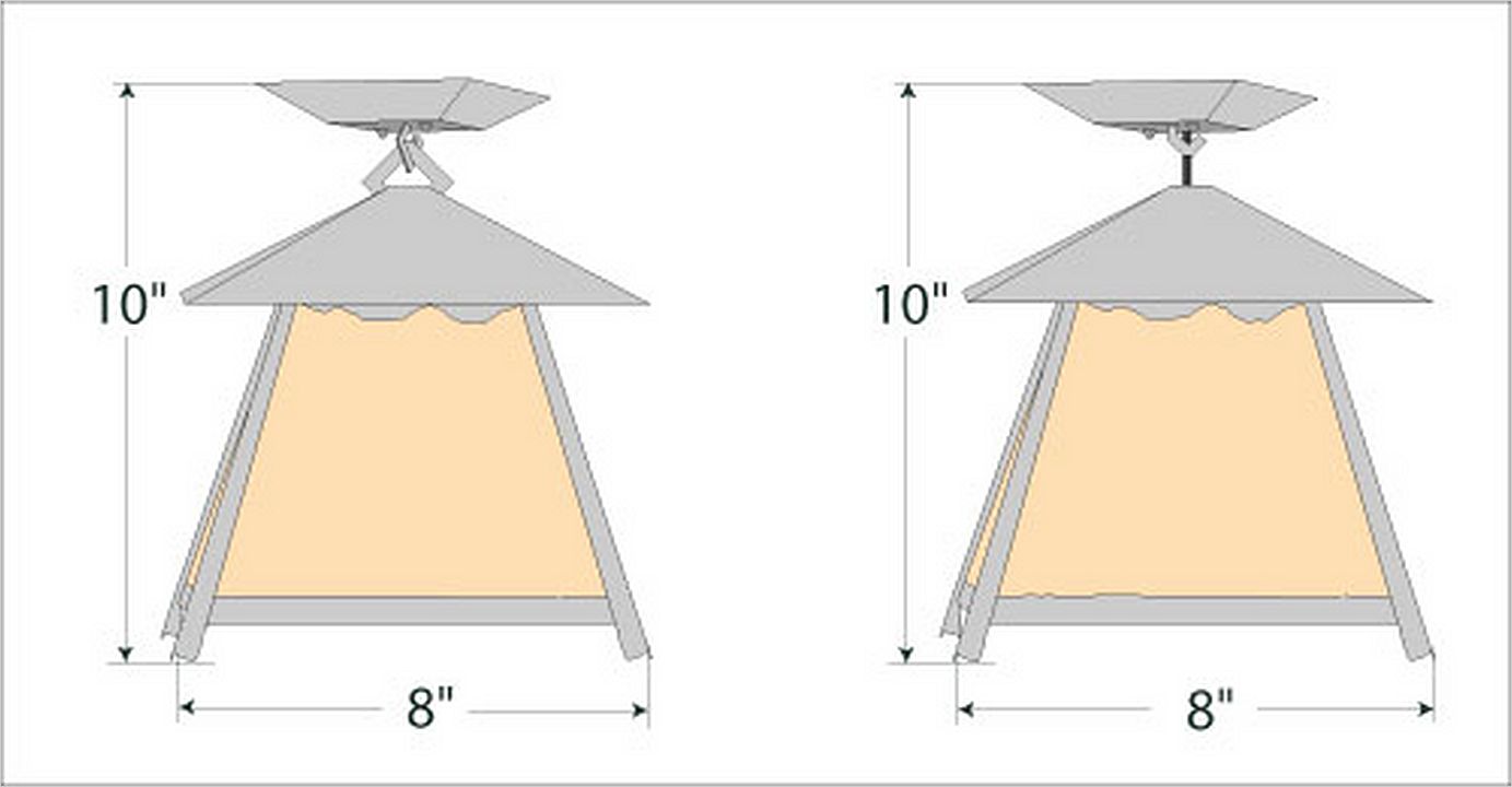 The Smoky Mtn Ceiling Light Small - Rustic Plain features our exclusive mountain artwork peeking out along the very top of each panel. The lantern also comes with a diffuser material choice between Almond or Amber mica. This fixture attaches to the ceiling with a square ceiling canopy, and is suitable for interior and damp locations only. This light will bring rustic lighting to any log home, cabin or northwood lodge-themed room.