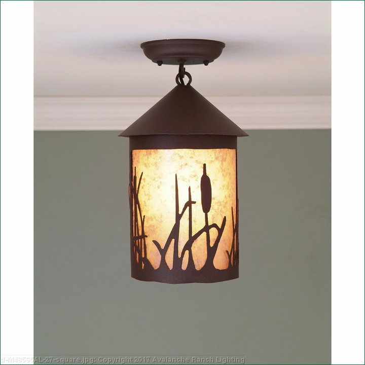 The Cascade Close-to-Ceiling Light Medium - Cattails features a 6 inch round cylinder with a cone top and a shade diffuser choice of color between Almond or Amber mica. It has cattails metal art on the front and back and solid bands on either side of the cylinder. Attaches to ceiling with a round ceiling canopy. Suitable for interior and damp locations only. This rustic ceiling light is ideal for bringing rustic lighting to any log home, cabin or northwood lodge-themed room.