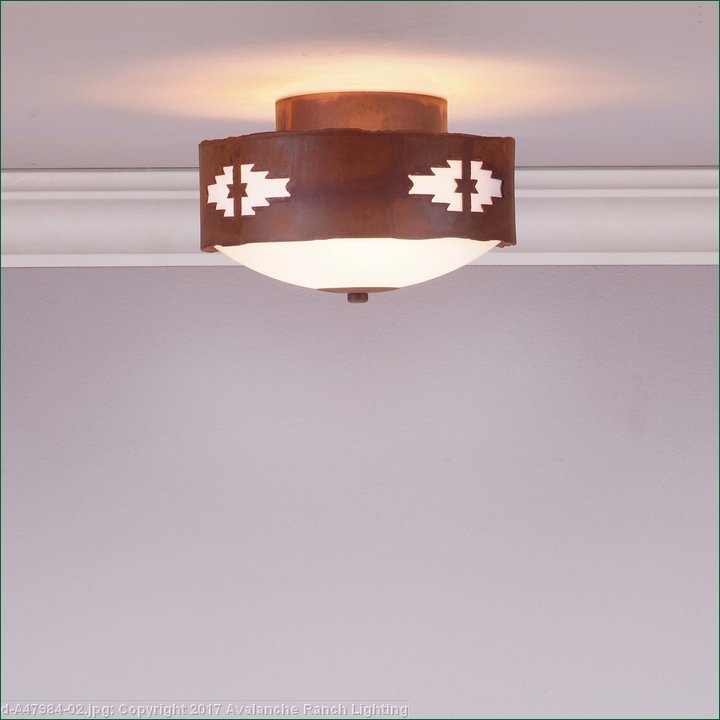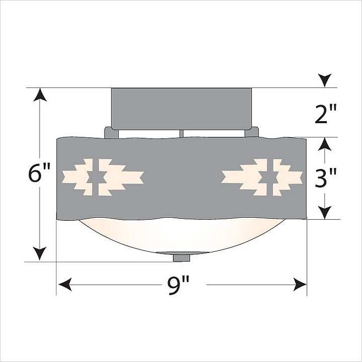 Our Ridgemont Close-to-Ceiling Small - Pueblo measures 9 inches in diameter and 6 inches high and features our exclusive southwest pueblo art cutouts around the circumference of a steel band. Behind each cutout is a diffuser panel. The frosted glass bottom bowl detaches for bulb changing. For an unique addition to your rustic ceiling light, order one of the decorative Bottom Kits: a three-tree, 3D Spruce Cone or a 3D Pine Cone, any which can be ordered in the same or different color as the fixture. This item is ideal for anyone looking for a non-hanging light to add rustic, Southwestern character to their log home, cabin or northwood lodge-themed room.