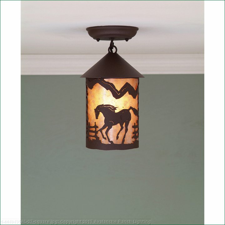The Cascade Close-to-Ceiling Light Small - Mtn Horse features a 4 inch round cylinder with a cone top and a shade diffuser choice of color between Almond or Amber mica. It has a horse and fence metal art image on the front and back and spruce trees on either side of the cylinder. Attaches to ceiling with a round ceiling canopy. Suitable for interior and damp locations only. This rustic ceiling light is ideal for bringing rustic westeern lighting to any log home, cabin or northwood lodge-themed room.