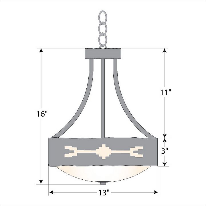 The Ridgemont Foyer Chandelier Medium - Del Rio is 13 inch in diameter and features our exclusive southwest del rio art cutouts around the circumference of the fixture. Behind each cutout is a diffuser panel. Offered with the curved arms and frost white glass bowl only. A matching ceiling canopy, 3 feet of chain and 10 extra feet of wire are also included. The rustic design of this light, along with the warm atmosphere created by its lighting, will add stylish southwestern character to any home.