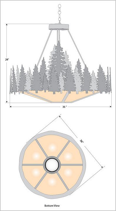 The Crestline Chandelier Large - Pine fixture is 36 inches in diameter and features various sizes of hand-painted trees over our rust patina finish. This chandelier will add warm lighting and rustic character to any log home, cabin or northwood lodge-themed room. The fixture comes with a choice of diffuser material: Almond Mica, Amber Mica, or Ivory Paper. A downlight and matching ceiling canopy are also included, along with 3 feet of chain and 10 feet of extra wire.