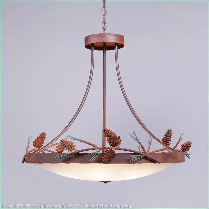 The Crestline Chandelier Small - Pine Cone fixture is 28 inches in diameter and features three sets of pine cone branches positioned around a metal band. Each metal pine cone is handmade, and the branch is textured to look life-like with metal wire pine needles. This rustic chandelier comes with the choice of either a frosted glass bowl (FC) or a tea-stained glass bowl (TS). The fixture also features our standard Curved Side Pipes (HR), but for an extra charge, we also make the Pine Branch Arms with pines cones and needles (HP). A downlight and matching ceiling canopy are also included, along with 3 feet of chain and 10 feet of extra wire. This chandelier will add rustic character to any log home, cabin or northwood lodge-themed room.