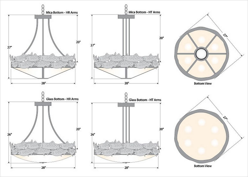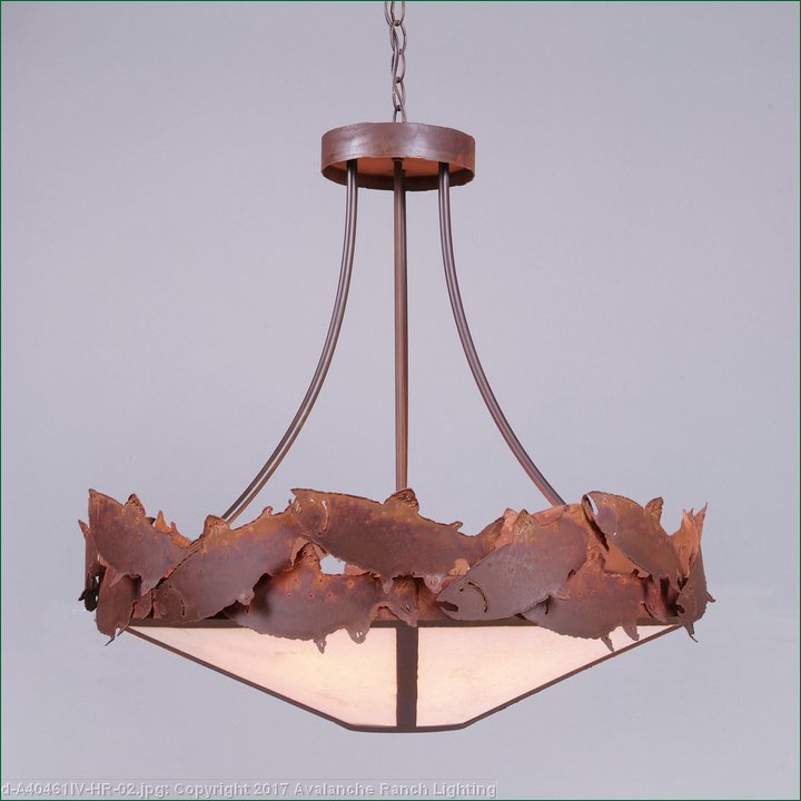 The Crestline Chandelier Medium - Salmon fixture is 28 inches in diameter and features images of salmon along the band of the fixture. This chandelier will add a touch of wildlife and rustic character to any log home, cabin or northwood lodge-themed room. The fixture comes with a choice of diffuser material: Almond Mica, Amber Mica, or Ivory Paper. A downlight and matching ceiling canopy are also included, along with 3 feet of chain and 10 feet of extra wire.