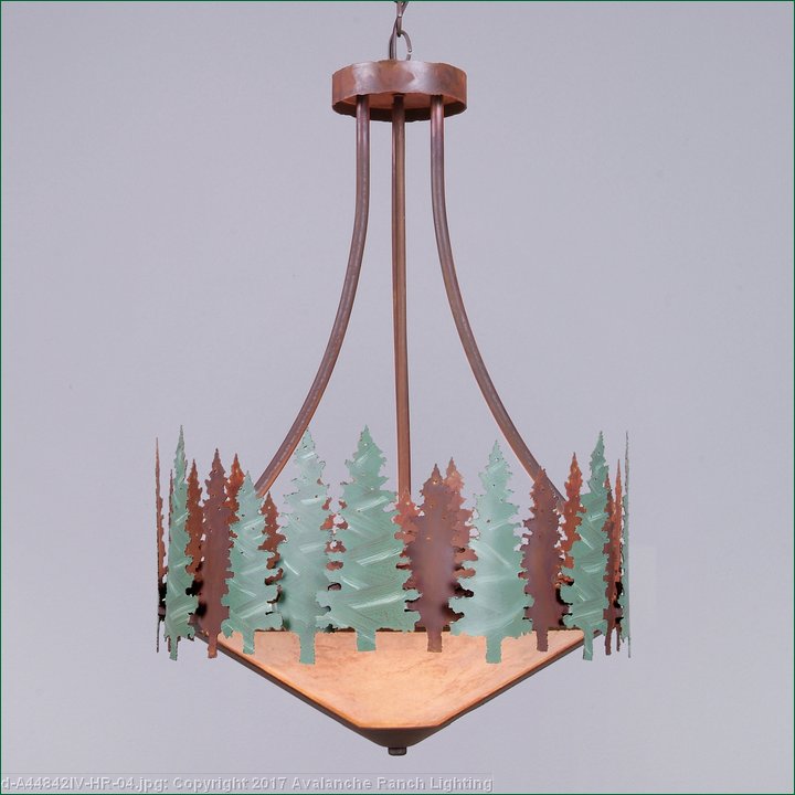 The Crestline Foyer Chandelier Tall - Pine Trees is 18 inches in diameter by 26 inches tall, and features our exclusive hand-painted pine trees. The fixture comes with a choice of diffuser material: Almond Mica, Amber Mica, or Ivory Paper. A matching ceiling canopy is also included, along with 3 feet of chain and 10 extra feet of wire. This forest-inspired chandelier will add a rustic, northwoods character to the entryway of any log home, cabin or northwood lodge-themed room.