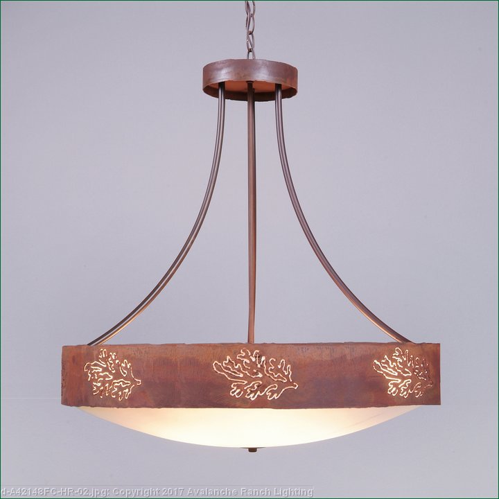 The Ridgemont Chandelier Medium - Cedar Bough Cutout is 27 inches in diameter and features our exclusive cedar bough cutout around the steel band. Behind each cutout is a diffuser panel. This rustic chandelier comes with the choice of either a frosted glass bowl (FC) or a tea-stained glass bowl (TS). A matching ceiling canopy is also included, along with 3 feet of chain and 10 extra feet of wire. This forest-inspired design will add a rustic, woodland character to any log home, cabin or northwood lodge-themed room.