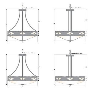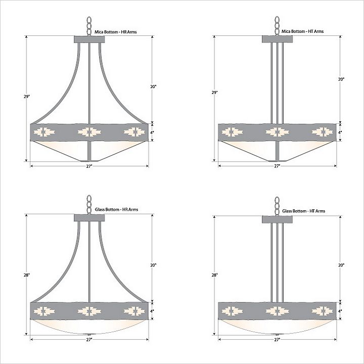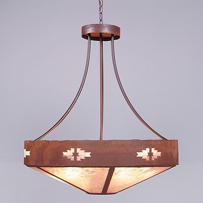 The Ridgemont Chandelier Medium - Pueblo is 27 inches in diameter and features our exclusive southwestern pueblo cutout around the steel band. Behind each cutout is a diffuser panel. This rustic chandelier comes with a choice of diffuser material: Almond Mica, Amber Mica or Ivory Paper. For the styles with a diffuser bottom, a single downlight is built into the bowl. A matching ceiling canopy is also included, along with 3 feet of chain and 10 extra feet of wire. This item will add a rustic, Southwestern character to any log home, cabin or northwood lodge-themed room.