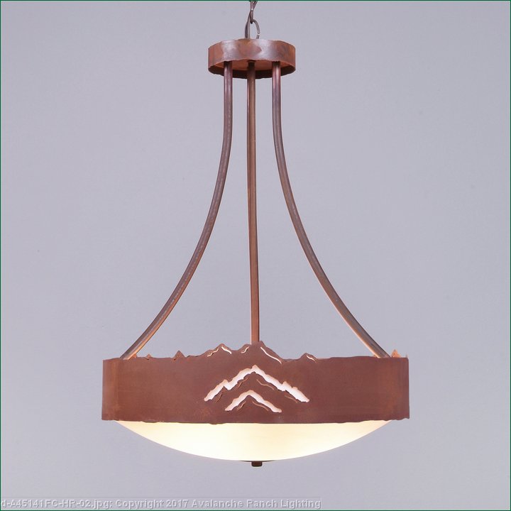 The Ridgemont Foyer Chandelier Large Tall -Glass Shade- Mountain Cutout is 17 inches in diameter by 23 inches tall, and features our exclusive mountain cutouts around the steel band. Behind each cutout is a diffuser panel. This rustic chandelier comes with the choice of either a frosted glass bowl (FC) or a tea-stained glass bowl (TS). A matching ceiling canopy is also included, along with 3 feet of chain and 10 extra feet of wire. This forest-inspired design will add a rustic, woodland character to the entryway of any log home, cabin or northwood lodge-themed room.