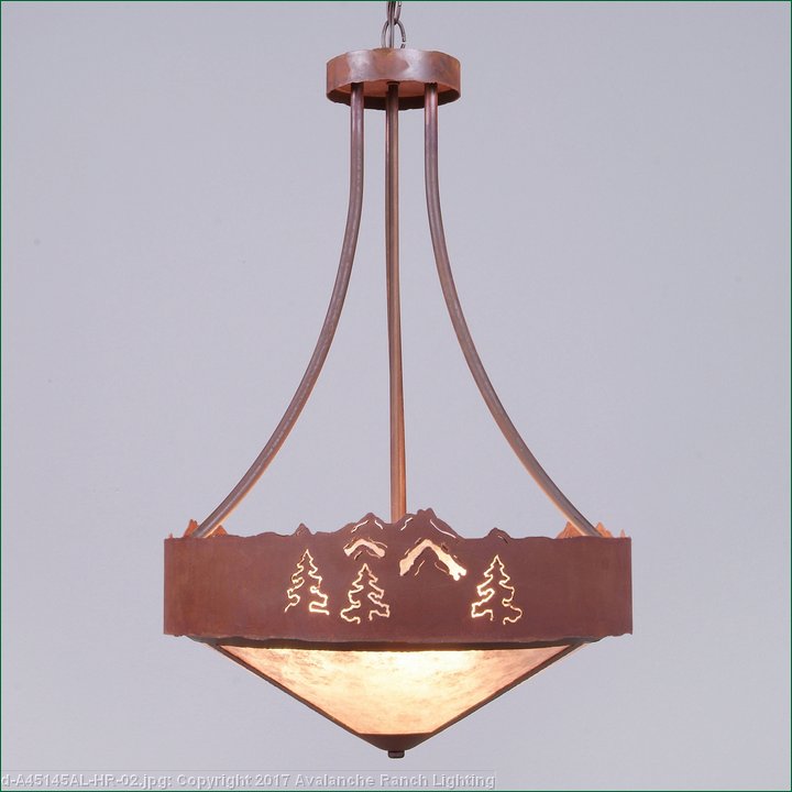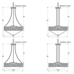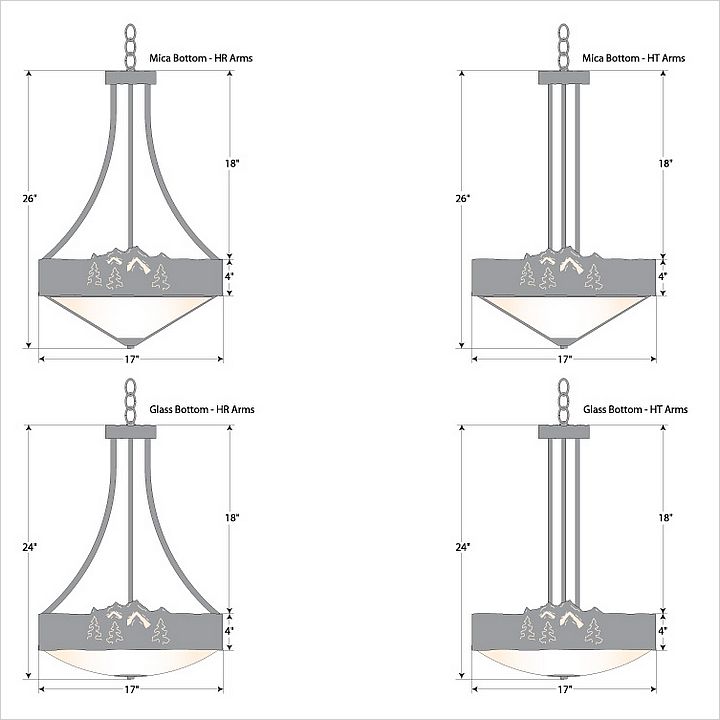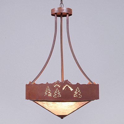 The Ridgemont Foyer Chandelier Large Tall - Shade Bottom- Mtn Pine Cutout is 17 inches in diameter by 25 inches tall, and features our exclusive mountain-pine cutouts around the steel band. Behind each cutout is a diffuser panel. This small chandelier comes with a choice of diffuser material: Almond Mica, Amber Mica, or Ivory Paper. A matching ceiling canopy is also included, along with 3 feet of chain and 10 extra feet of wire. This forest-inspired design will add a rustic, woodland character to the entryway of any log home, cabin or northwood lodge-themed room.
