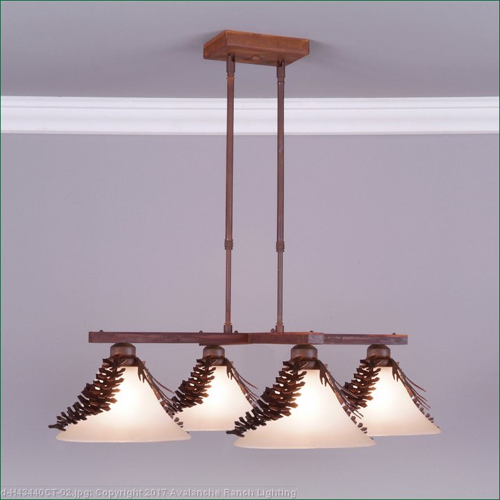The Cedarwood 4 Light Chandelier - Spruce Cone features four bulbs, adjustable height stems and a choice of two different styles of cone glass. Surrounding each piece of glass is our exclusive three dimensional spruce cone artwork. Included with the fixture is 10 feet of wire and two telescoping stems that have a 12 inch adjustment range from 15 to 27 inches. For longer adjustments up to 138 inches, order one or more of the extension kits. A matching 5 by 6 inch ceiling canopy is also included. To add extensions to stem length, use accessory kits for double stem fixtures PK460. For vaulted ceilings, use accessory Kit CK422