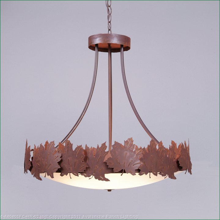 The Crestline Chandelier Medium - Maple fixture is 28 inches in diameter and features a band of metal maple leaves. The leaves are positioned in various directions along the band, and also feature hand-cut interior lines inside each image. This rustic chandelier comes with the choice of either a frosted glass bowl (FC) or a tea-stained glass bowl (TS). A downlight and matching ceiling canopy are also included, along with 3 feet of chain and 10 feet of extra wire. This chandelier will add rustic character to any log home, cabin or northwood lodge-themed room.