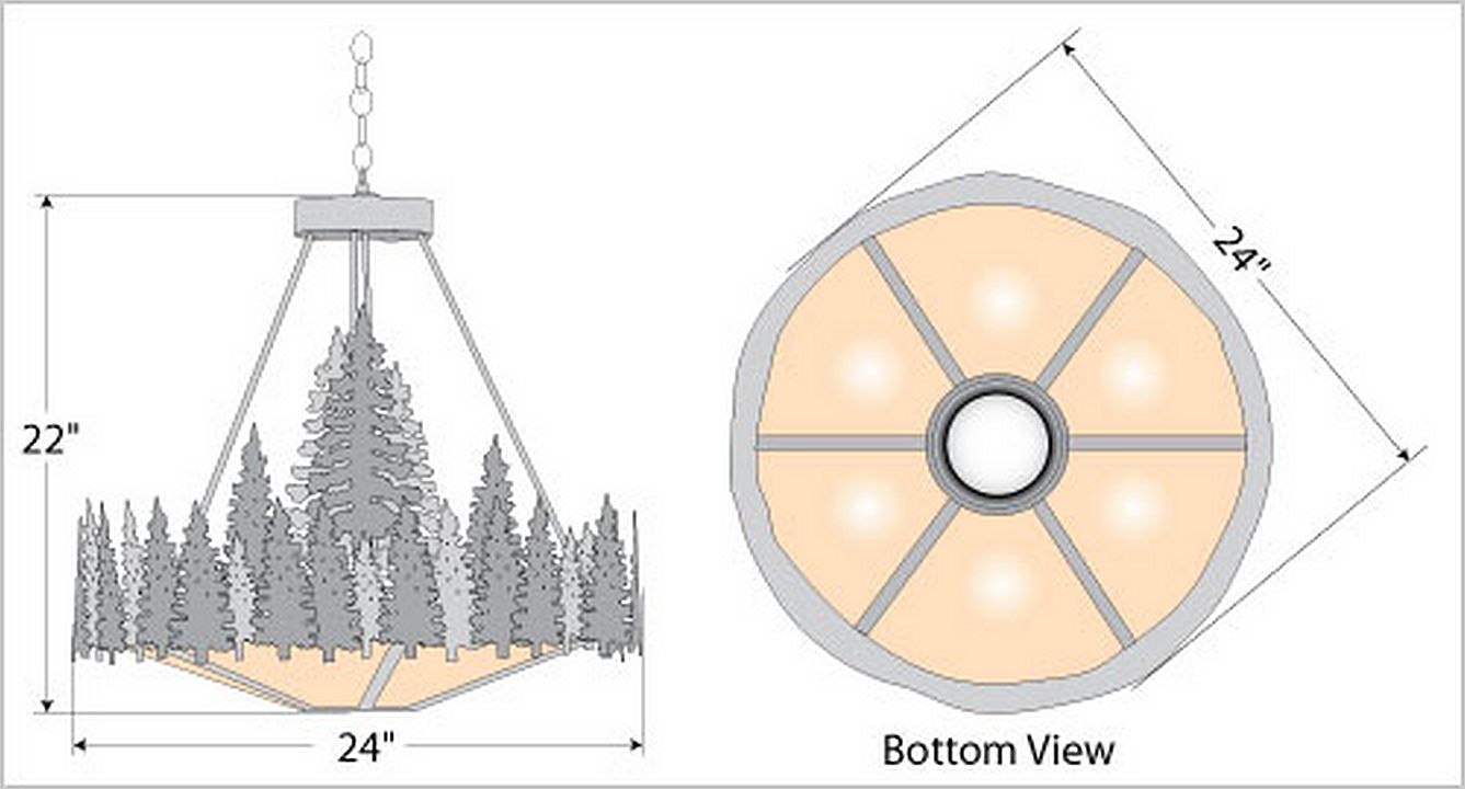 The Crestline Chandelier Small - Pine fixture is 24 inches in diameter and features various sizes of hand-painted trees over our rust patina finish. This chandelier will add warm lighting and rustic character to any log home, cabin or northwood lodge-themed room. The fixture comes with a choice of diffuser material: Almond Mica, Amber Mica, or Ivory Paper. A downlight and matching ceiling canopy are also included, along with 3 feet of chain and 10 feet of extra wire.