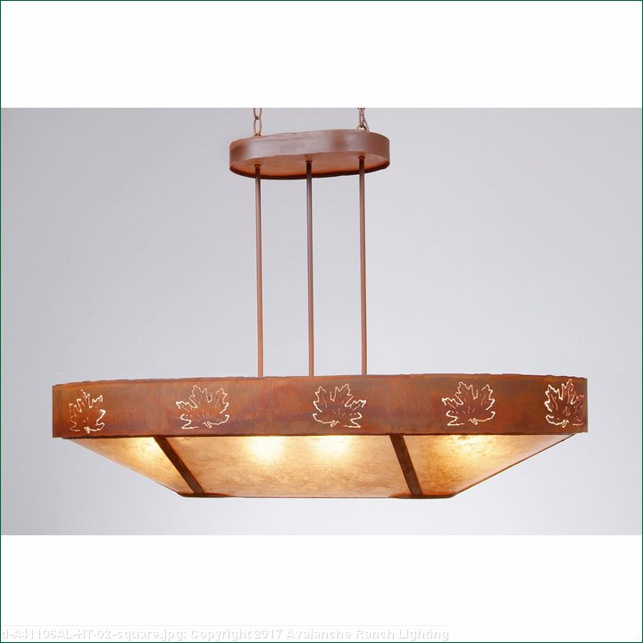 The Ridgemont Chandelier Oval - Maple Cutout fixture is oval shaped 24 by 42 inches and features maple leaves cutout around the band of the chandelier. This item is ideal for anyone looking for a chandelier to add rustic character to their log home, cabin or northwood lodge-themed room. It comes with a choice of diffuser material: Almond Mica, Amber Mica, or Ivory Paper. There are also two downlights for direct lighting to a table. A matching ceiling canopy, along with 6 feet of chain (for a 3 foot drop) and 10 extra feet of wire are also included.