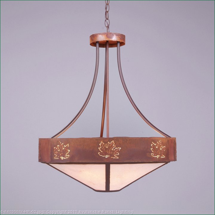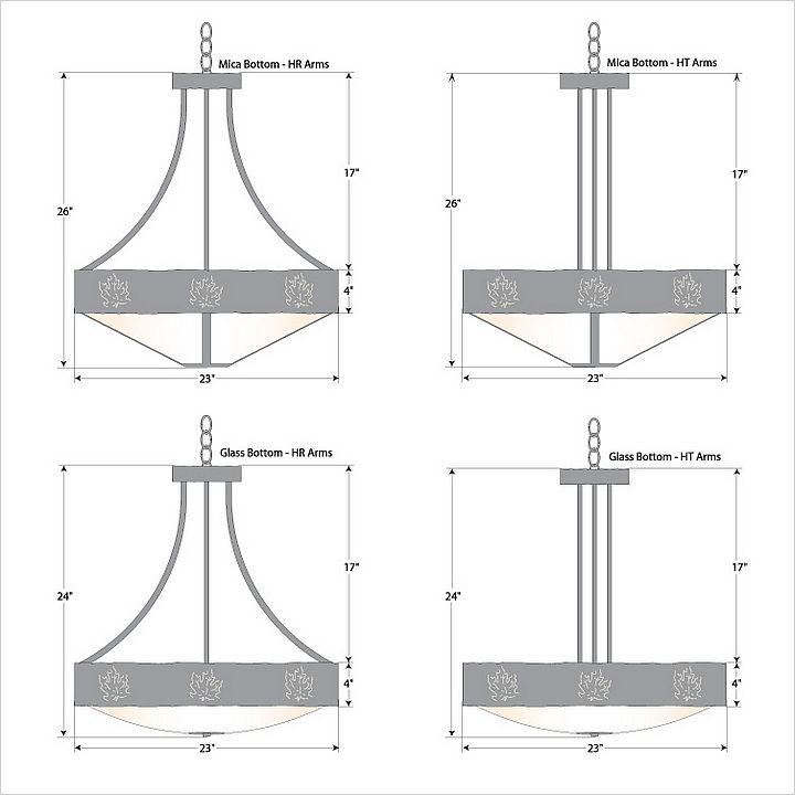 The Ridgemont Chandelier Small - Maple Cutout is 24 inches in diameter, and features our exclusive maple leaf cutouts around the steel band. Behind each cutout is a diffuser panel. This rustic chandelier comes with a choice of diffuser material: Almond Mica, Amber Mica or Ivory Paper. For the styles with a diffuser bottom, a single downlight is built into the bowl. A matching ceiling canopy is also included, along with 3 feet of chain and 10 extra feet of wire. This forest-inspired design will add a rustic, woodland character to any log home, cabin or northwood lodge-themed room.