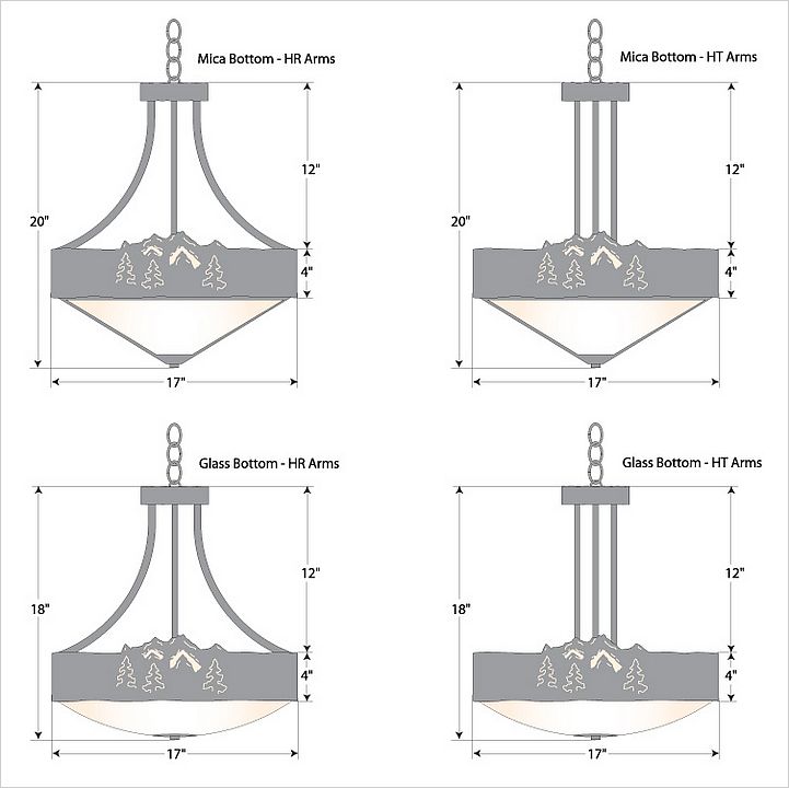 The Ridgemont Foyer Chandelier Large Short - Glass Bottom- Mtn Pine Cutout is 17 inches in diameter by 17 inches tall, and features our exclusive mountain-pine cutouts around the steel band. Behind each cutout is a diffuser panel. This small chandelier comes with the choice of either a frosted glass bowl (FC) or a tea-stained glass bowl (TS). A matching ceiling canopy is also included, along with 3 feet of chain and 10 extra feet of wire. This forest-inspired design will add a rustic, woodland character to the entryway of any log home, cabin or northwood lodge-themed room.