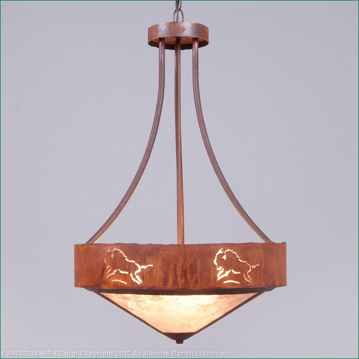 The Ridgemont Foyer Chandelier Large Tall - Shade Bottom- Bison Cutout is 17 inches in diameter by 25 inches tall, and features our exclusive southwestern bison cutouts around the steel band. Behind each cutout is a diffuser panel. This small chandelier comes with a choice of diffuser material: Almond Mica, Amber Mica, or Ivory Paper. A matching ceiling canopy is also included, along with 3 feet of chain and 10 extra feet of wire. This item will add a rustic, Southwestern character to the entryway of any log home, cabin or northwood lodge-themed room.
