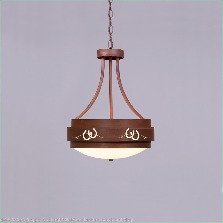 The Northridge Foyer Chandelier Small- Barb Wire and Horseshoe fixture features three steel bands- in your choice of finish- arranged on top of one another, the center band with hand-cut horseshoe images going around the circumference of the fixture. Behind each cutout are thin acrylic panels and a glass bowl - your choice of frost white or tea-stained - is attached in the center. This equestrian inspired design is ideal for anyone looking for a rustic chandelier to add cowboy character to their log home, cabin or northwood lodge-themed room. A matching ceiling canopy, 3 feet of chain and 10 extra feet of wire are also included.