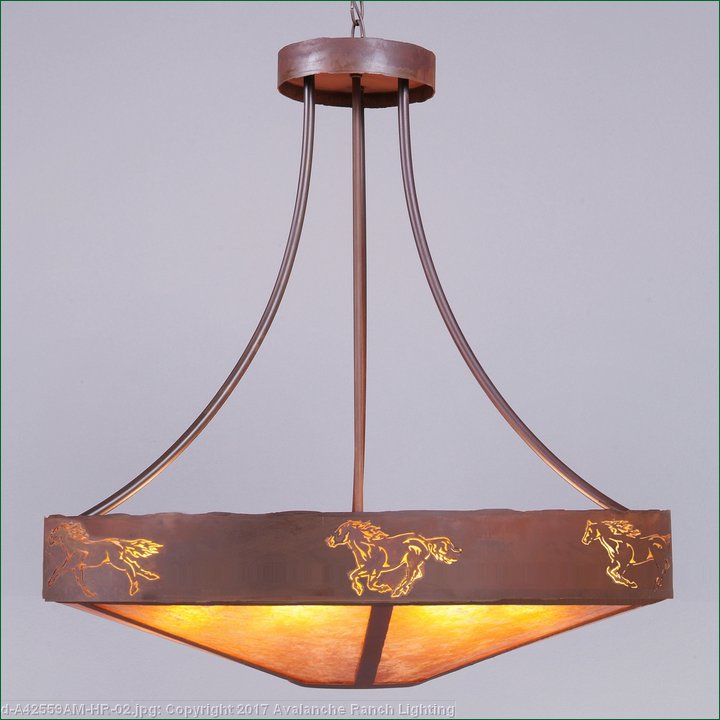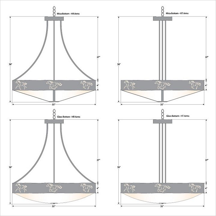 The Ridgemont Chandelier Large - Horse Cutout is 35 inches in diameter and features our exclusive horse cutout around the steel band. Behind each cutout is a diffuser panel. This rustic chandelier comes with a choice of diffuser material: Almond Mica, Amber Mica or Ivory Paper. For the styles with a diffuser bottom, a single downlight is built into the bowl. A matching ceiling canopy is also included, along with 3 feet of chain and 10 extra feet of wire. This chandelier will add a rustic, western character to any log home, cabin or northwood lodge-themed room.