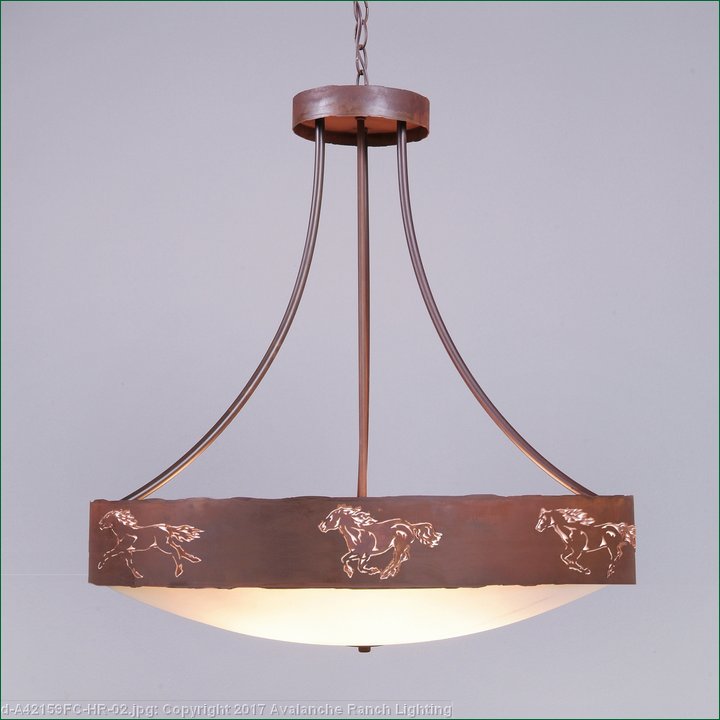 The Ridgemont Chandelier Medium - Horse Cutout is 27 inches in diameter and features our exclusive horse cutout around the steel band. Behind each cutout is a diffuser panel. This rustic chandelier comes with the choice of either a frosted glass bowl (FC) or a tea-stained glass bowl (TS). A matching ceiling canopy is also included, along with 3 feet of chain and 10 extra feet of wire. This chandelier will add a rustic, western character to any log home, cabin or northwood lodge-themed room.