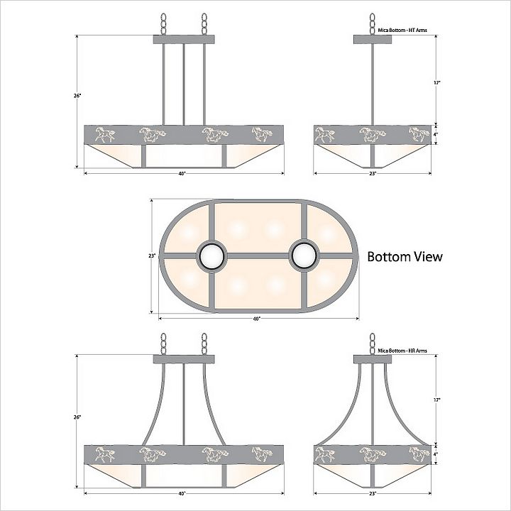 The Ridgemont Chandelier Oval - Horse Cutout fixture is oval shaped 24 by 42 inches and features horse cutouts around the band of the chandelier. This item is ideal for anyone looking for a chandelier to add rustic character to their log home, cabin or northwood lodge-themed room. It comes with a choice of diffuser material: Almond Mica, Amber Mica, or Ivory Paper. There are also two downlights for direct lighting to a table. A matching ceiling canopy, along with 6 feet of chain (for a 3 foot drop) and 10 extra feet of wire are also included.