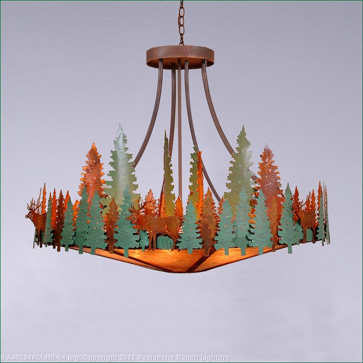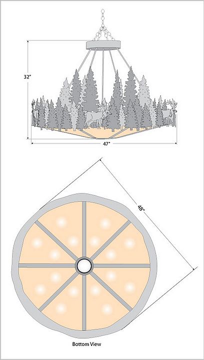 The Crestline Chandelier Extra Large - Elk fixture is 48 inches in diameter and features images of elk and hand-painted trees over our rust patina finish. This chandelier will add a touch of wildlife and rustic character to any log home, cabin or northwood lodge-themed room. The fixture comes with a choice of diffuser material: Almond Mica, Amber Mica, or Ivory Paper. A downlight and matching ceiling canopy are also included, along with 3 feet of chain and 10 feet of extra wire.