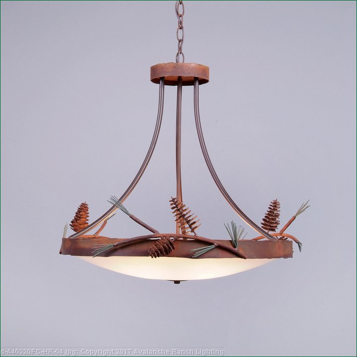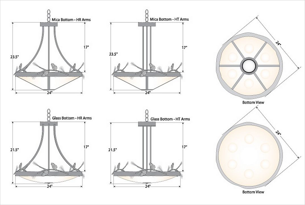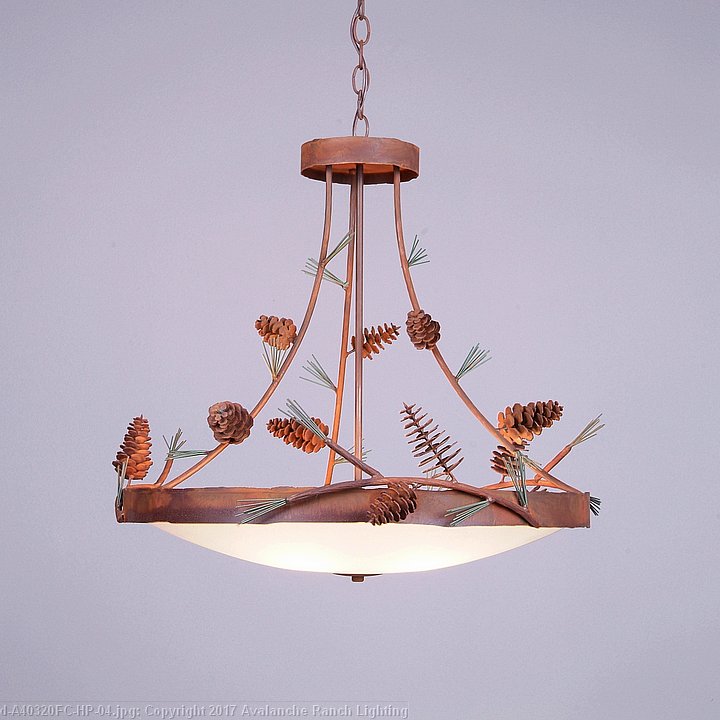 The Crestline Chandelier Small - Pine Cone fixture is 24 inches in diameter and features three sets of pine cone branches positioned around a metal band. Each metal pine cone is handmade, and the branch is textured to look life-like with metal wire pine needles. This rustic chandelier comes with the choice of either a frosted glass bowl (FC) or a tea-stained glass bowl (TS). The fixture features our standard Curved Side Pipes (HR), but for an extra charge, we also make the Pine Branch Arms with pines cones and needles (HP). A downlight and matching ceiling canopy are also included, along with 3 feet of chain and 10 feet of extra wire. This chandelier will add rustic character to any log home, cabin or northwood lodge-themed room.