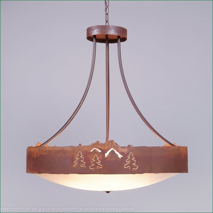 The Ridgemont Chandelier Medium - Mountain/Pine is 27 inches in diameter and features our exclusive mountain-pine cutout around the steel band. Behind each cutout is a diffuser panel. This rustic chandelier comes with the choice of either a frosted glass bowl (FC) or a tea-stained glass bowl (TS). A matching ceiling canopy is also included, along with 3 feet of chain and 10 extra feet of wire. This forest-inspired design will add a rustic, woodland character to any log home, cabin or northwood lodge-themed room.