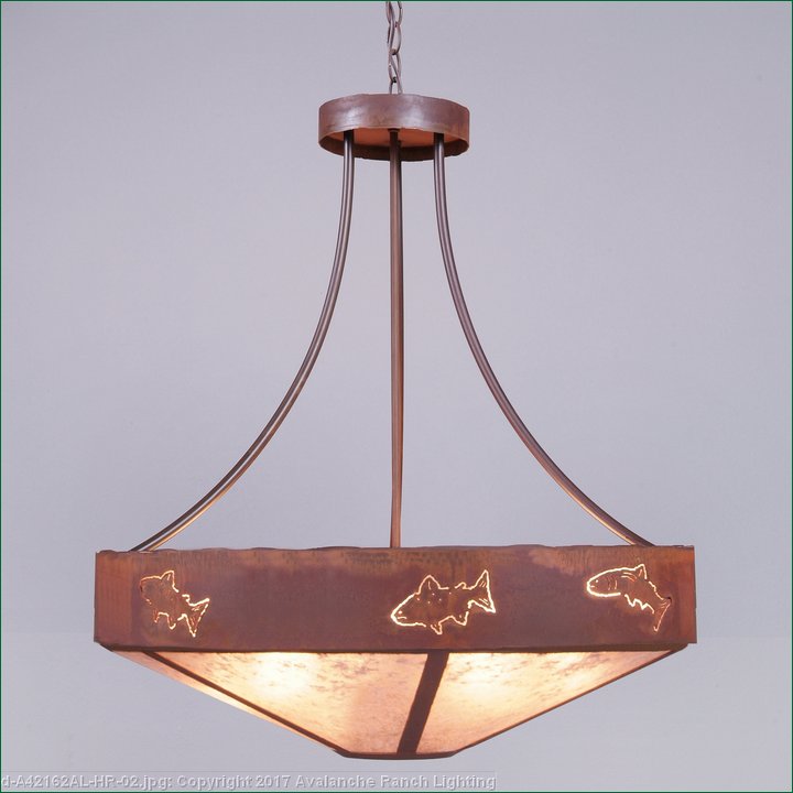 The Ridgemont Chandelier Medium - Fish Cutout is 27 inches in diameter and features our exclusive salmon and trout cutouts around the steel band. Behind each cutout is a diffuser panel. This rustic chandelier comes with a choice of diffuser material: Almond Mica, Amber Mica or Ivory Paper. For the styles with a diffuser bottom, a single downlight is built into the bowl. A matching ceiling canopy is also included, along with 3 feet of chain and 10 extra feet of wire. This fishing-inspired chandelier will add a rustic, northwoods character to any log home, cabin or northwood lodge-themed room.