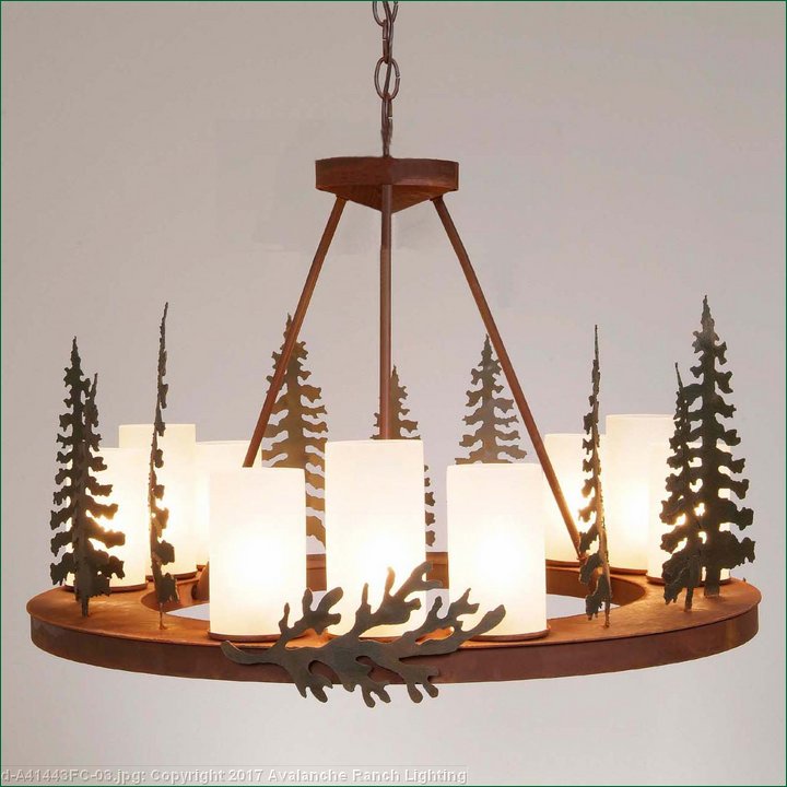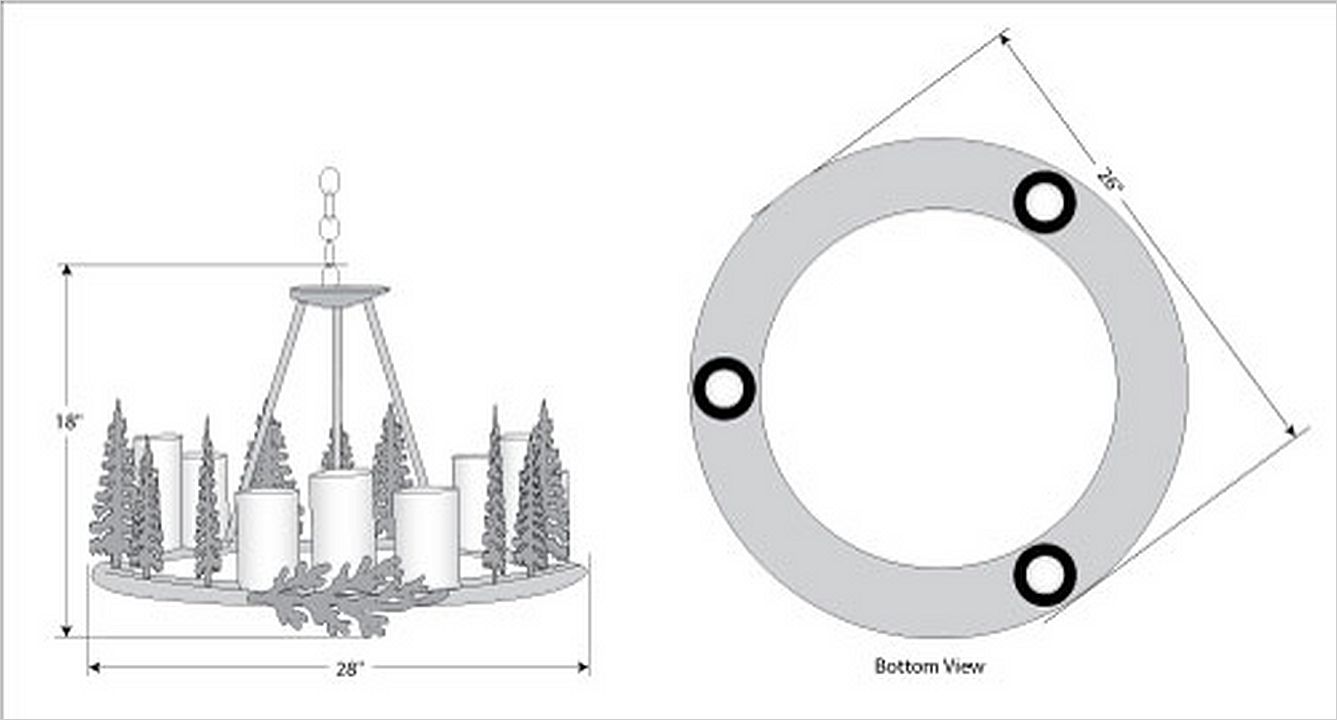 The Wisley Round Chandelier Large - Cedar features a one- inch thick round band holding 6 candelabra bulbs with five, 5 inch tall cylinder glass pieces for covering them. Choice of glass between frost clear or tea stain. Optionally for underneath, there are three type G4 20W halogen bulbs on a separate switch for lighting the area under the light. Hand-painted trees set on top of the band, while a single cedar bough is placed in front of each of the bulb sets around the band. This chandelier is ideal for anyone looking to bring rustic character to the ceiling lighting in their log home, cabin or northwood lodge-themed room. A matching ceiling canopy, 3 ft of chain and 10 extra feet of wire are also included.