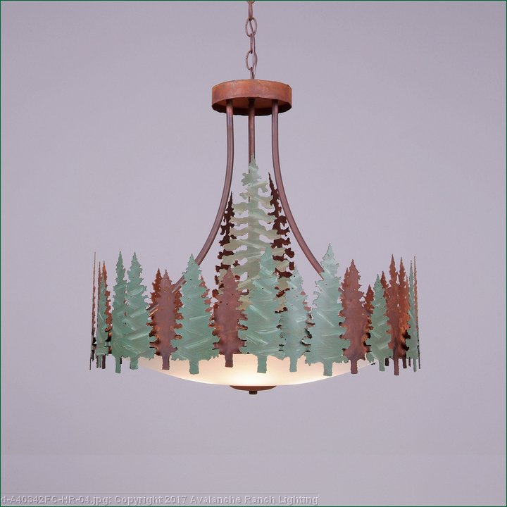 The Crestline Chandelier Small - Pine fixture is 24 inches in diameter and features various sizes of hand-painted trees over our rust patina finish. This chandelier will add warm lighting and rustic character to any log home, cabin or northwood lodge-themed room. This rustic chandelier comes with the choice of either a frosted glass bowl (FC) or a tea-stained glass bowl (TS). A downlight and matching ceiling canopy are also included, along with 3 feet of chain and 10 feet of extra wire.