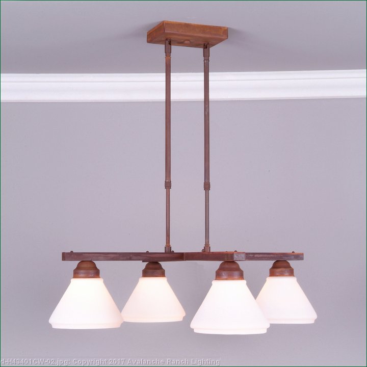 The Cedarwood 4 Light Chandelier - Rustic Plain features four bulbs, adjustable height stems and a choice of two different styles of cone glass. Included with the fixture is 10 feet of wire and two telescoping stems that have a 12 inch adjustment range from 15 to 27 inches. For longer adjustments up to 138 inches, order one or more of the extension kits. A matching 5 by 6 inch ceiling canopy is also included. To add extensions to stem length, use accessory kits for double stem fixtures PK460. For vaulted ceilings, use accessory Kit CK422