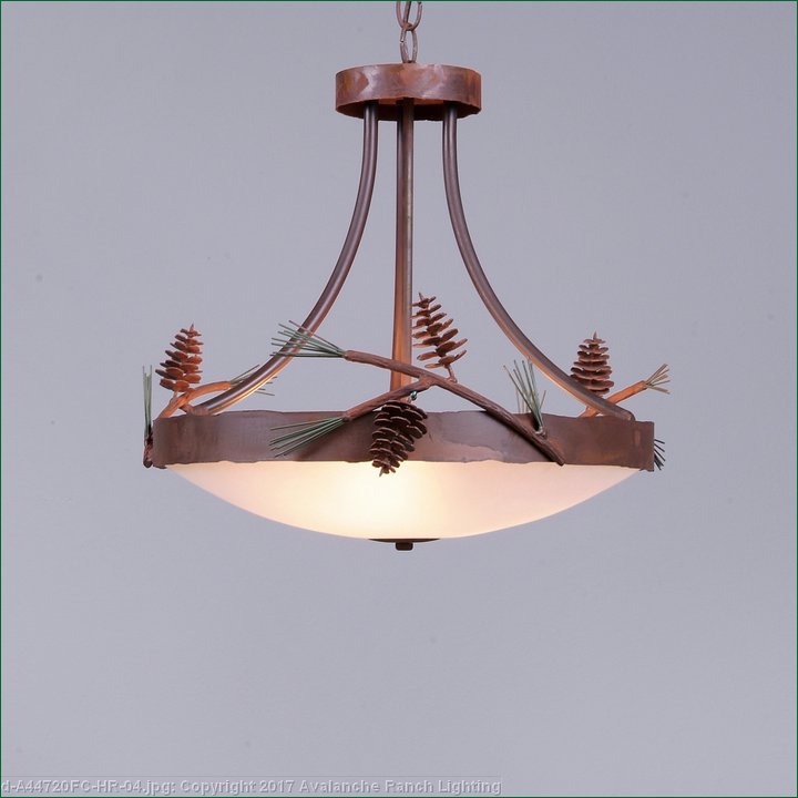 The Crestline Foyer Chandelier Short - Pine Cone is 18 inches in diameter by 17 inches tall, and features three sets of pine cone branches positioned around a metal band. Each metal pine cone is handmade, and the branch is textured to look life-like with metal wire pine needles. This rustic chandelier comes with the choice of either a frosted glass bowl (FC) or a tea-stained glass bowl (TS). The fixture features our standard Curved Side Pipes (HR), but for an extra charge, we also make the Pine Branch Arms with pines cones and needles (HP). A matching ceiling canopy is also included, along with 3 feet of chain and 10 extra feet of wire. This forest-inspired chandelier will add a rustic, northwoods character to the entryway of any log home, cabin or northwood lodge-themed room.
