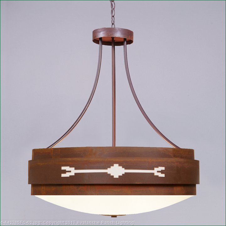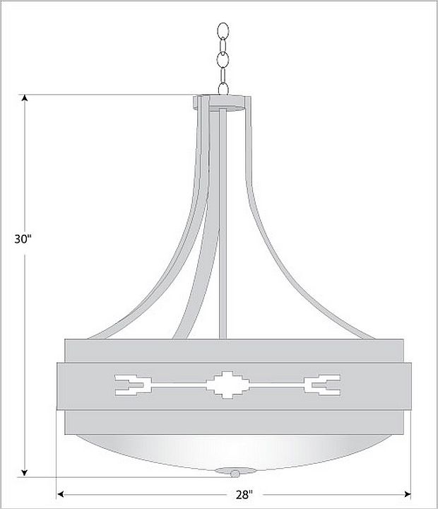 The Northridge Chandelier Large - Del Rio fixture features three steel bands arranged on top of one another, the center band with hand-cut Southwest-inspired images going around the circumference of the fixture. Behind each cutout is thin acrylic panels and a frost white glass bowl is attached in the center. This light is ideal for anyone looking for a rustic chandelier to add Southwestern character to their log home, cabin or northwood lodge-themed room. A matching ceiling canopy, 3 feet of chain and 10 extra feet of wire are also included.