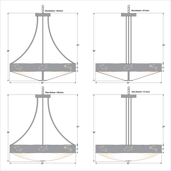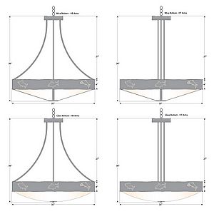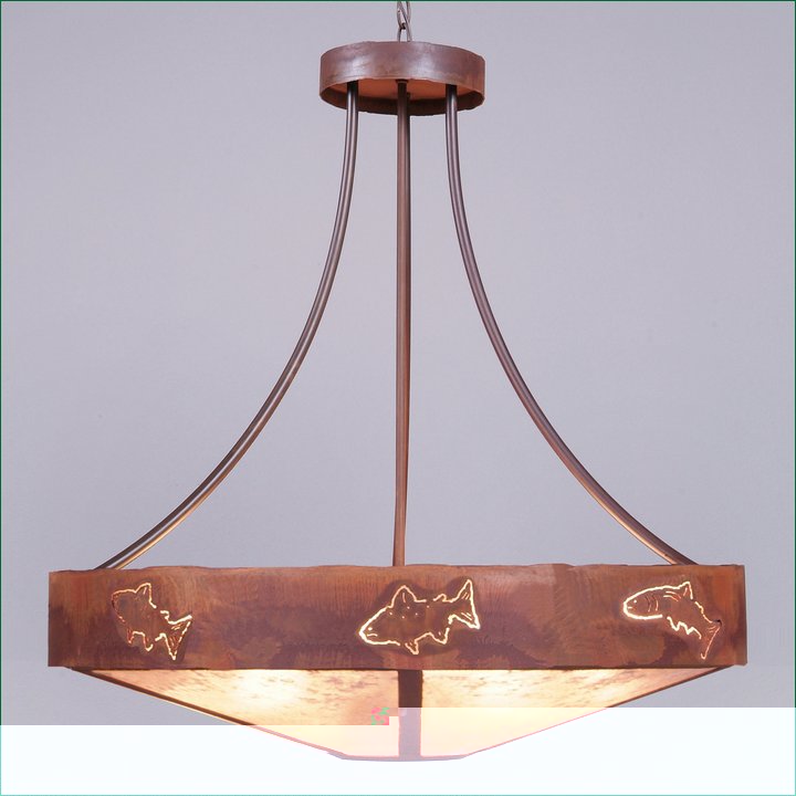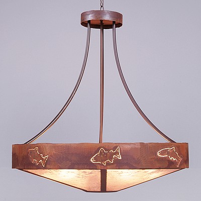The Ridgemont Chandelier Large - Fish Cutout is 35 inches in diameter and features our exclusive salmon and trout cutouts around the steel band. Behind each cutout is a diffuser panel. This rustic chandelier comes with a choice of diffuser material: Almond Mica, Amber Mica or Ivory Paper. For the styles with a diffuser bottom, a single downlight is built into the bowl. A matching ceiling canopy is also included, along with 3 feet of chain and 10 extra feet of wire. This fishing-inspired chandelier will add a rustic, northwoods character to any log home, cabin or northwood lodge-themed room.