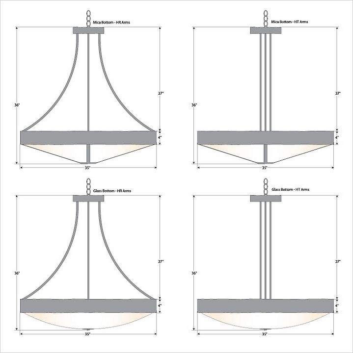 The Ridgemont Chandelier Large - Rustic Plain is 35 inches in diameter and features a rustic metal band. This rustic chandelier comes with a choice of diffuser material: Almond Mica, Amber Mica or Ivory Paper. For the styles with a diffuser bottom, a single downlight is built into the bowl. A matching ceiling canopy is also included, along with 3 feet of chain and 10 extra feet of wire. This fixture has a rustic-contemporary style, and will bring warm lighting and character to any home.