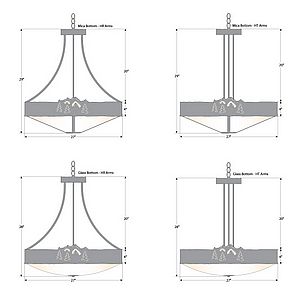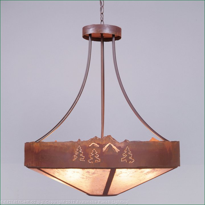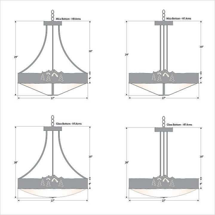 The Ridgemont Chandelier Medium - Mountain/Pine is 27 inches in diameter and features our exclusive mountain-pine cutout around the steel band. Behind each cutout is a diffuser panel. This rustic chandelier comes with a choice of diffuser material: Almond Mica, Amber Mica or Ivory Paper. For the styles with a diffuser bottom, a single downlight is built into the bowl. A matching ceiling canopy is also included, along with 3 feet of chain and 10 extra feet of wire. This forest-inspired design will add a rustic, woodland character to any log home, cabin or northwood lodge-themed room.