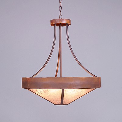 The Ridgemont Chandelier Small - Rustic Plain is 24 inches in diameter and features a rustic metal band. This rustic chandelier comes with a choice of diffuser material: Almond Mica, Amber Mica or Ivory Paper. For the styles with a diffuser bottom, a single downlight is built into the bowl. A matching ceiling canopy is also included, along with 3 feet of chain and 10 extra feet of wire. This fixture has a rustic-contemporary style, and will bring warm lighting and character to any home.
