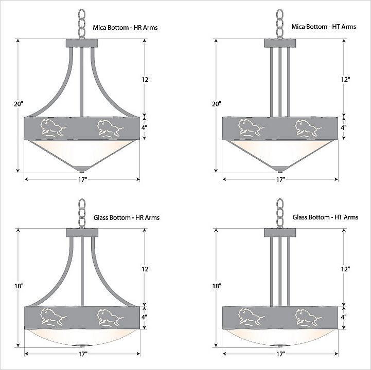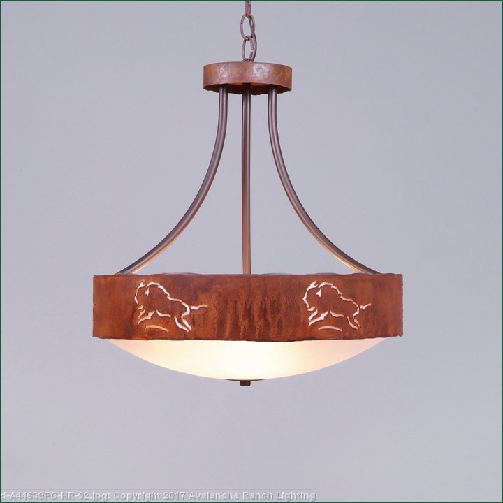 The Ridgemont Foyer Chandelier Large Short - Glass Bottom- Bison Cutout is 17 inches in diameter by 17 inches tall, and features our exclusive southwest bison cutouts around the steel band. Behind each cutout is a diffuser panel. This small chandelier comes with the choice of either a frosted glass bowl (FC) or a tea-stained glass bowl (TS). A matching ceiling canopy is also included, along with 3 feet of chain and 10 extra feet of wire. This item will add a rustic, Southwestern character to the entryway of any log home, cabin or northwood lodge-themed room.