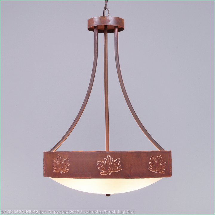 The Ridgemont Foyer Chandelier Large Tall - Glass Shade- Maple Cutout is 17 inches in diameter by 23 inches tall, and features our exclusive maple leaf cutouts around the steel band. Behind each cutout is a diffuser panel. This rustic chandelier comes with the choice of either a frosted glass bowl (FC) or a tea-stained glass bowl (TS). A matching ceiling canopy is also included, along with 3 feet of chain and 10 extra feet of wire. This forest-inspired design will add a rustic, woodland character to the entryway of any log home, cabin or northwood lodge-themed room.