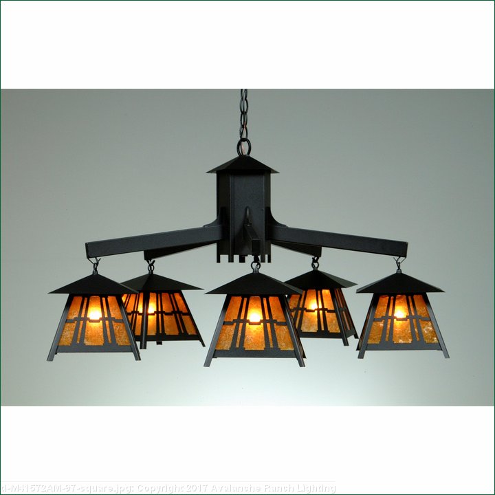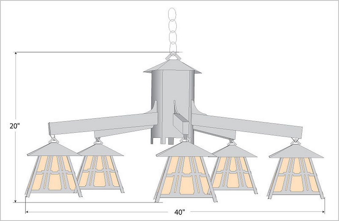 The Smoky Mtn 5 Light Chandelier - Eastlake features our Smoky Mtn small lanterns hanging at a slight downward angle from five steel arms. The front and side panels all feature our exclusive mission-style artwork. The lanterns also come with a diffuser material choice between Almond or Amber mica. A square ceiling canopy is included, along with 3 feet of chain and 10 extra feet of wire. This Mission-style chandelier will bring warm lighting and character to any cottage, home, or craftsman-styled room.