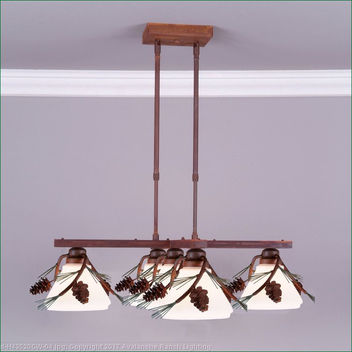 The Cedarwood 5 Light Chandelier - Pine Cone features five bulbs, adjustable height stems and a choice of two different styles of cone glass. Surrounding each piece of glass is our exclusive three dimensional pine cone artwork. Included with the fixture is 10 feet of wire and two telescoping stems that have a 12 inch adjustment range from 15 to 27 inches. For longer adjustments up to 138 inches, order one or more of the extension kits. A matching 5 by 6 inch ceiling canopy is also included. To add extensions to stem length, use accessory kits for double stem fixtures PK460. For vaulted ceilings, use accessory Kit CK422